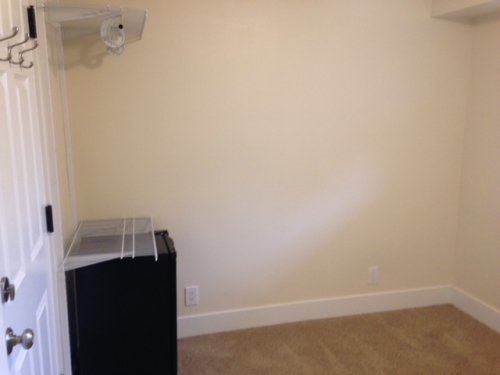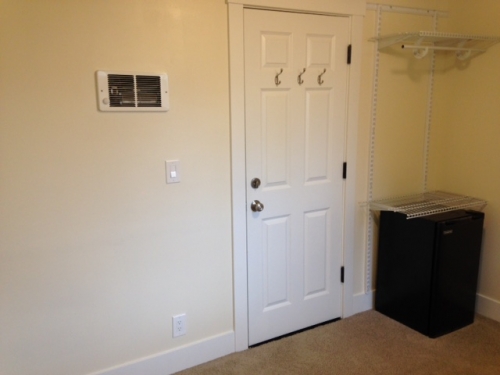 Room can fit a twin or full bed, desk, dresser and reading chair, adjustable shelving built in, free mini fridge in room